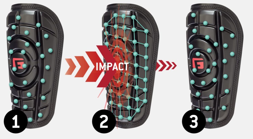 Advanced material hardens on impact, dispersing energy while remaining lightweight and flexible.